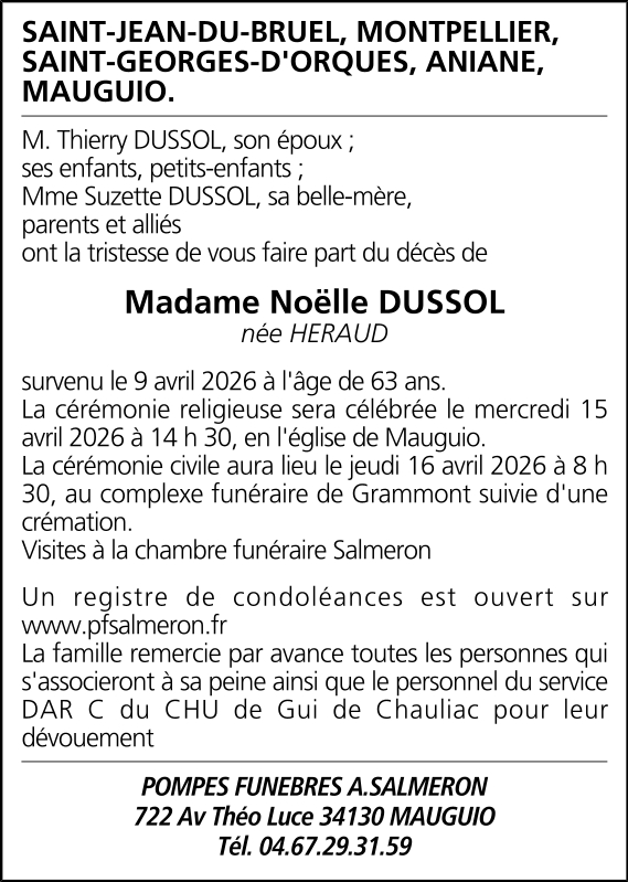 Avis de décès de Madame Noëlle DUSSOL née HERAUD