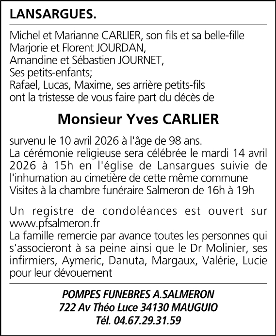 Avis de décès de Monsieur Yves CARLIER