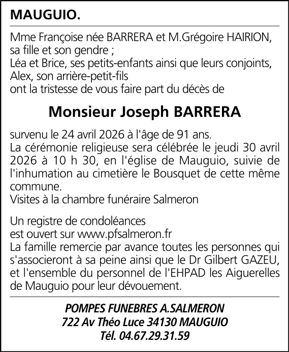 cimetière Le Bousquet à Mauguio demain, jeudi 30 avril à 11 heures 30