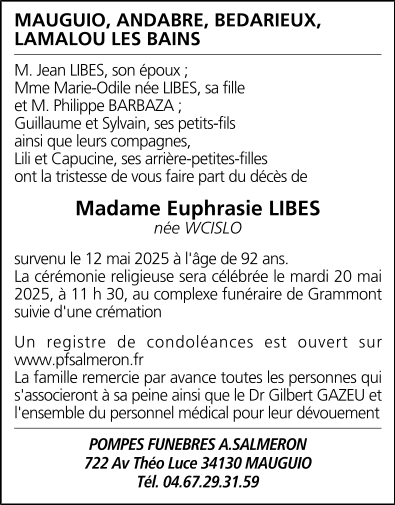 Décédée à Mauguio (34130, France) le lundi 12 mai 2025 à l'âge de 92 ans