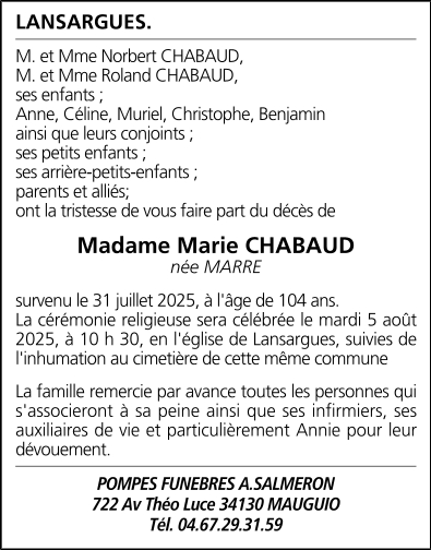 Décédée à Lansargues (34130, France) le jeudi 31 juillet 2025 à l'âge de 104 ans