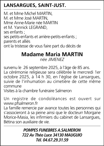 Décédée à Lansargues (34130, France) le vendredi 26 septembre 2025 à l'âge de 85 ans