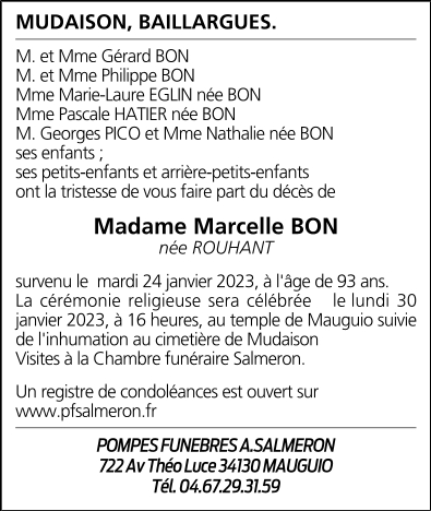 Décédée à Mudaison (34130, France) le mardi 24 janvier 2023 à l'âge de 93 ans